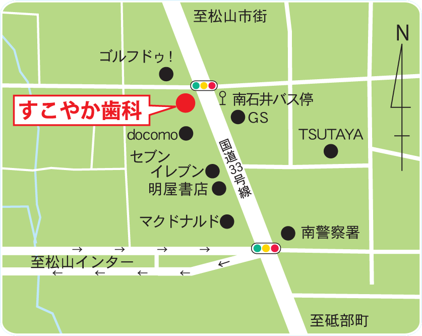診療時間 アクセス 診療時間 HOURS 診察時間 月 火 水 木 金 土 日 9:00-13:00 ◎ ◎ ※ ◎ ◎ ◎ × 14:30-19:00 ○ ○ ※ ○ ◎* ★ × ◎はご予約にて託児を承ります。◎*金曜日の診療は18時までになります。★土曜日の診療は17:00まで(託児予約可)になります。 ※祝日のある週の水曜日は診療します。 ※臨時休診・診察時間変更させていただく場合がございます。当院を初めて受診される方の受付は17:30までとなります。 アクセス ACCESS 医院名 すこやか歯科 住所 〒791-1105愛媛県松山市北井門2丁目21-26 電話番号 089-957-8817 アクセス 松山インターすぐそば伊予鉄バス「南石井」停留所前 付近見取り図 <googleマップ>